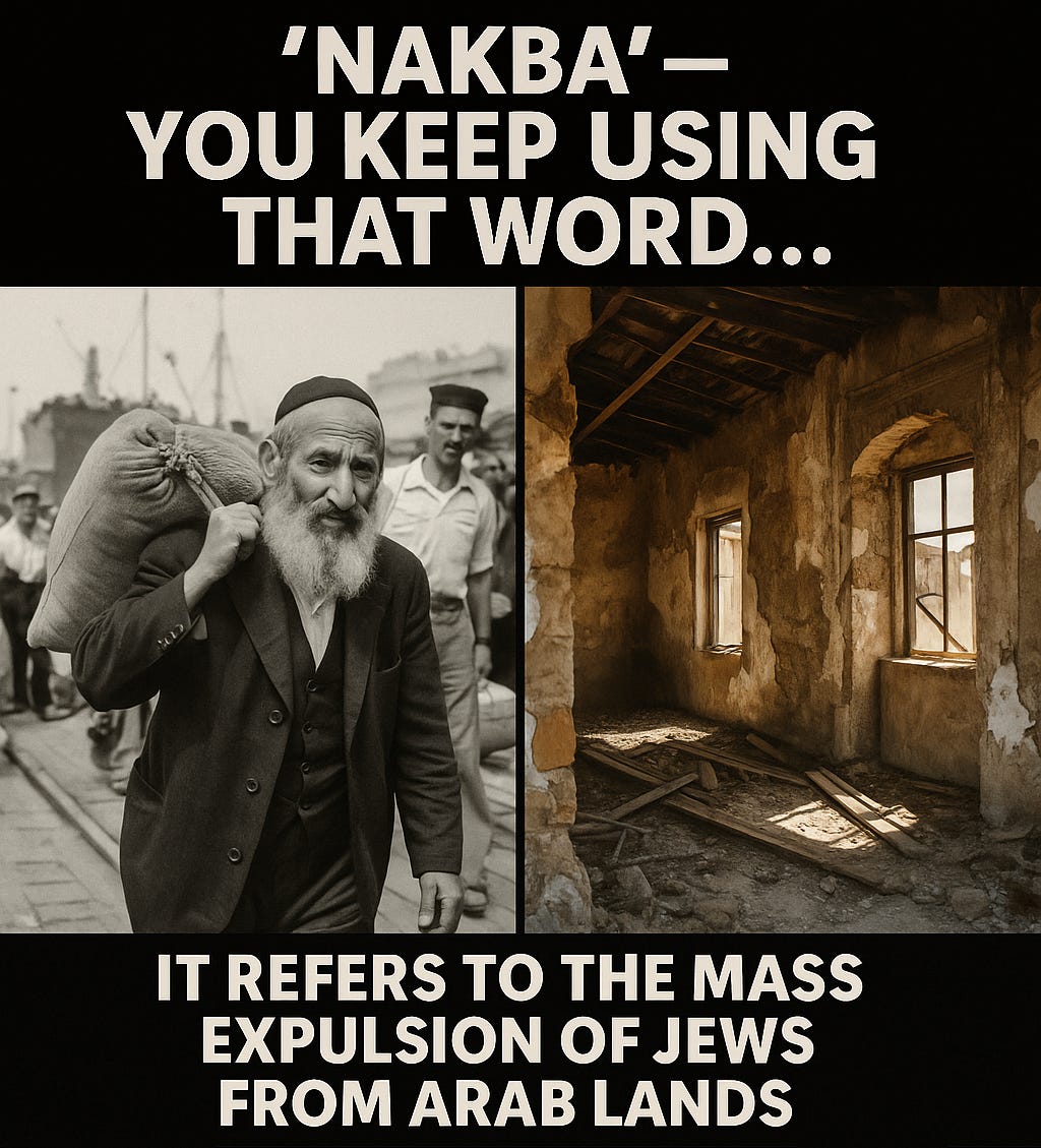 From 1948 onward, over 850,000 Jews were expelled or forced to flee from Arab lands across the Middle East and North Africa. These Jews—indigenous to Baghdad, Cairo, Aleppo, Tripoli, and countless other cities for millennia—were stripped of their property, their citizenship, and their heritage. Entire communities were obliterated. That is Nakba. A catastrophe not only in scale, but in silence. And it’s time we give it the name it deserves.